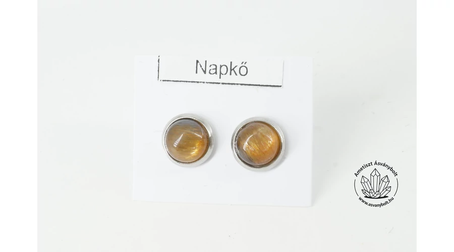 A Napkő mindig is a figyelem középpontjában volt a csillogó fényjátékával. Nagyon népszerű drágakő, új lelőhelye Tanzánia. Az extra minőségű Holdkő Napkő vagy fekete napkő különlegessége, hogy barnás és fekete színben is található. A holdkőben csillogó hematit lemezkék adják a különlegességét, ami általában fehér alapszínben, de ezen a lelőhelyen barnás és fekete alapszínben is látható. A belőle csiszolt arany barna kaboson alul lapos, felül domború csiszolású, a kő mérete kb. 8 mm és 4 – 4,5 mm magas, teljes felületén tökéletes csiszolt, félautomata gépeken készült. Ezeket ragasztottuk bele a peremes nemesacél alapba beszúrós fülinek. A füli hátuljára gumi harangot illesztettünk. A kövek színe természetes, a képen látott darabhoz hasonlóakat tudunk küldeni.