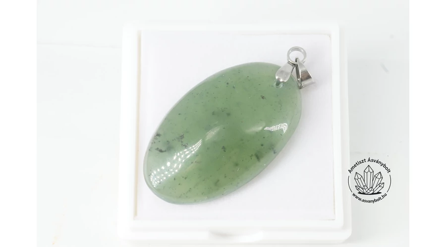 A nemesszerpentin nevű csoportba ásványokat és kőzeteket gyűjtünk össze. Azokat, amik csiszolhatók és ékszernek vagy dísztárgynak felhasználhatók. Nagyon sok fajtájuk van, puha ásványok, legfeljebb 3,5 – 4-es Mohs keménység szerint. Nagyon szép tört fehér, sárga, zöld színű ásványok tartoznak ide szerpentin néven, mint az ezoterikus nevű Atlantiszit vagy a kereskedelmi néven kínai jade nevű szerpentin ásvány, aminek a rendes neve antigorit. Persze vannak szerpentin kőzetek is, dísztárgyak faragására használják, Magyarországhoz közel Ausztriában Berstein ( Borostyánkő) nevű település mellett vagy a kelet-szlovákiai Dobsina melletti már bezárt bánya anyagában is voltak szerpentin kőzetek. Az Antigorit legjobb minőségben hasonló színű a jadéval, áttetsző, sötétzöld, emiatt csiszolják ékszereknek és dísztárgyaknak. A legszebb átlátszó vagy áttetsző darabokból alul lapos, felül domború kaboson fomákat csiszoltak indiai műhelyekben, amiket saját műhelyünkben fúrtunk, nemesacél alkatrészekkel medálnak készítettünk el. A medál mérete alkatrésszel együtt kb. 42,5 x 20 mm. A medált 4 x 4 cm-es ékszerdobozban küldjük.
