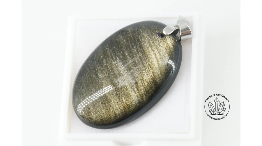 Az Obszidiánok nemes változata az arany obszidián. Nem fekete, hanem inkább szürke, az anyagában nagyon vékony csövecskék vannak, a vulkáni üveg kihűlési csövecskéi, ami a vastagságuk miatt arany színű fényt ver vissza magáról, ha jó irányból csiszolták az anyagát. Ha a csövecskékre enyhén domborúan és párhuzamosan csiszolták az anyagot, akkor az egész felülete aranyos fényű lehet. Ez az aranyos felület a medál felső oldalán tökéletes. Ilyenek a bemutatott formára csiszolt kabosonok, amiket indiai műhelyekben tökéletesen csiszoltak, itthon a saját műhelyünkben csak fúrtuk majd nemesacél alkatrésszel szereltük viselhető medálnak. A medál méretei alkatrésszel együtt kb. 48 x 25 mm, 4 x 4 cm-es ékszerdobozkában küldjük.