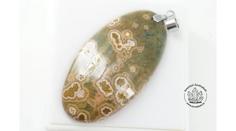 Az Óceán jáspis egy különleges átkovásodott, kalcedonnal, jáspissal és opállal kitöltött riolit féleség, amit Madagaszkáron bányásznak. Az Óceán-jáspis vagy más néven orbikuláris óceán-jáspis féldrágakő felületén színes sávokat, rajzolatokat, virágszerű mintákat és szem szerű foltokat láthatunk. Minél nagyobb a felület, annál látványosabb a mintázat. A felületen üregeket is láthatunk, benne fehér és zöldes színű kvarckristályokkal. A legszebb mintázatú darabokból alul lapos, felül domború kaboson fomákat csiszoltak indiai műhelyekben, amiket saját műhelyünkben fúrtunk, nemesacél alkatrészekkel medálnak készítettünk el. A medál mérete alkatrésszel együtt kb. 58 x 24 mm. A medált 5 x 5 cm-es ékszerdobozban küldjük.