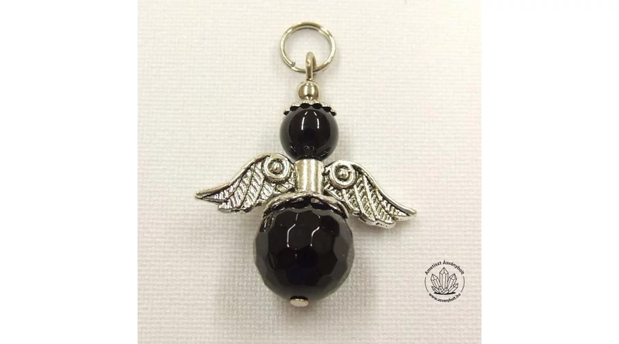 Az Ónix féldrágakő fazettált 10 mm-es és sima 6 mm-es golyóiból és egyéb antiallergén alkatrészekből készítettünk új angyalmedált a Vásárlóink kérésére.