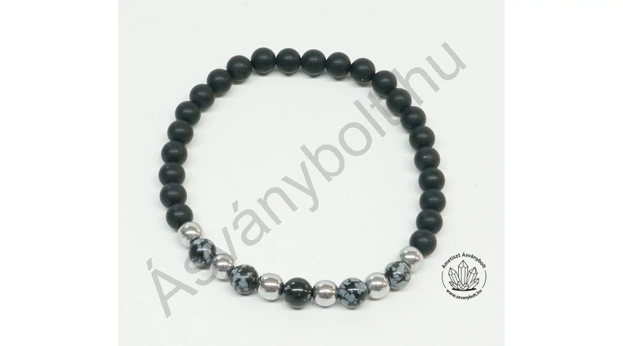 A népszerű Ónix matt 6 mm-es golyóit színesítettük ezüstös Hematittal és Hópehely obszidiánnal. Az anyagokat duplasoros gumira fűztük kb. 18 cm belső mérettel.