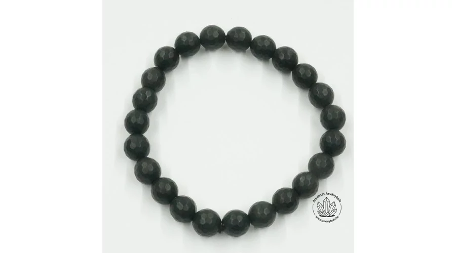 Az Ónix természetes színében unalmas fekete, ezért különféle kezelésekkel érdekessé teszik. Ezt az anyagot nem fényesítették ki és pici lapokat is csiszoltak a golyókra, ezért érdekesebb és divatosabb lesz. Az anyagból kb 19 cm-t duplasoros gumira fűztünk.
