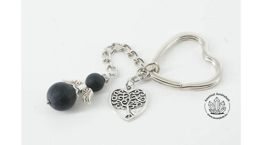 Az Ónix matt csiszolású 12 mm-es és 8 mm-es golyóiból készítettünk angyalkát díszítő szerelékekkel, ezeket egy szív formájú kulcstartóra szerkesztettük egy életfa mintás szív medállal. A szív formájú kulcstartó mérete kb. 29 mm magas. A szerelékek réz ródium bevonatos fémek és a szív formájú kulcstartó vas alkatrész. A terméket kulcstartónak, táskadísznek is lehet használni.