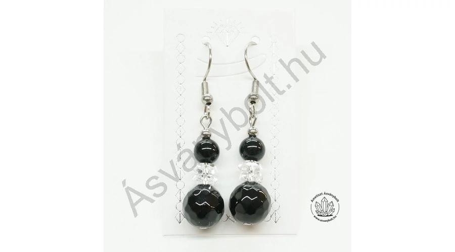 Az Ónix legjobb minőségű fekete színű 6-os és 10 mm-es fazettált golyóit szereltük össze nemesacél alkatrészekkel fülinek. A füli magassága kb: 45 mm, a fülikártya magassága kb. 55 mm.