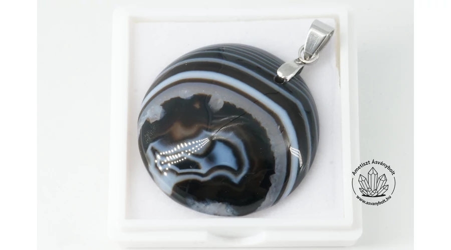 Az achátok feketére festett, áttetsző, enyhén sávos változatából csiszolt kaboson mérete kb. 30 mm, az alapján lapos, felülről enyhén domború, mindkét felületén fényes. Egy különleges rajzolatú darabból készítettem fúrt medált, a képen látható darabot küldjük a megrendelőnek. Kínában készült extra minőségű csiszolatokból dolgozunk, a fúrást és nemesacél alkatrészeket saját műhelyünkben készítettük. A medál alkatrésszel együtt kb. 41 mm magas.