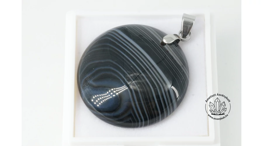 Az achátok feketére festett, áttetsző, enyhén sávos változatából csiszolt kaboson mérete kb. 30 mm, az alapján lapos, felülről enyhén domború, mindkét felületén fényes. Egy különleges rajzolatú darabból készítettem fúrt medált, a képen látható darabot küldjük a megrendelőnek. Kínában készült extra minőségű csiszolatokból dolgozunk, a fúrást és nemesacél alkatrészeket saját műhelyünkben készítettük. A medál alkatrésszel együtt kb. 41 mm magas.