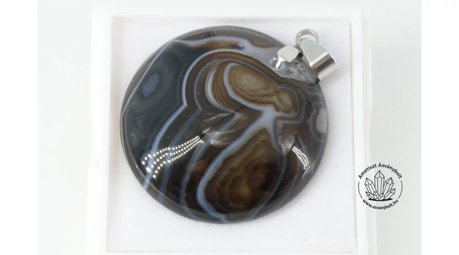 Az achátok feketére festett, áttetsző, enyhén sávos változatából csiszolt kaboson mérete kb. 30 mm, az alapján lapos, felülről enyhén domború, mindkét felületén fényes. Egy különleges rajzolatú darabból készítettem fúrt medált, a képen látható darabot küldjük a megrendelőnek. Kínában készült extra minőségű csiszolatokból dolgozunk, a fúrást és nemesacél alkatrészeket saját műhelyünkben készítettük. A medál alkatrésszel együtt kb. 41 mm magas.