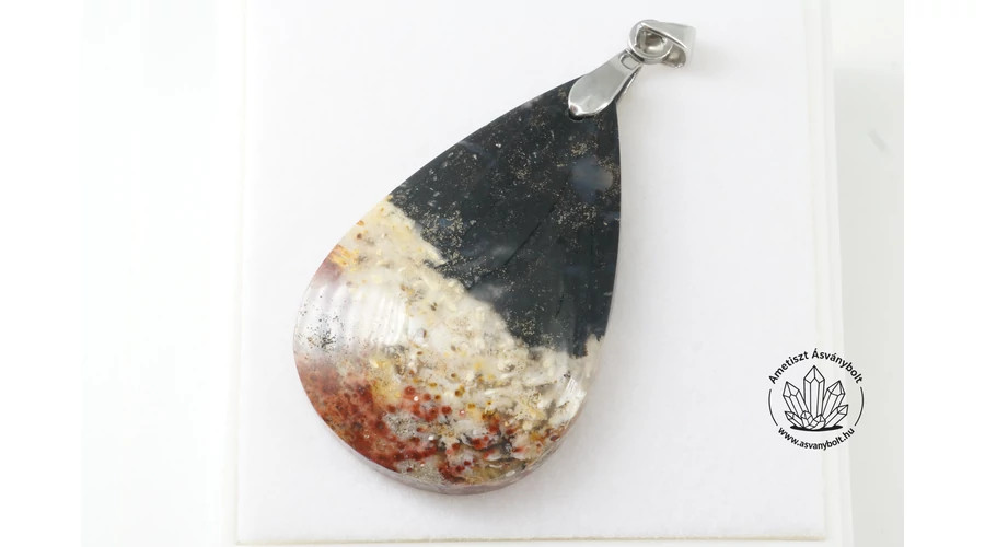 A vulkáni tevékenység utóhatása a forró vizes oldatok megjelenése, mint gejzírek vagy tavak. Bizonyos képződési folyamatokban az akkor élt fa vagy egyéb növényi anyagok elbomlanak és a szerkezetüket a forró vizes oldatokban oldott opál vagy kovasav kitölti, a színüket az oldatok oldott vas tartalma adja. Ezek a kövületek a faopálok és a kövült fák. A kettő között a beépült kovasav kikristályosodása, megszilárdulása adja a különbséget a maradványok keménységében, tartósságában. Bárhol ahol vulkáni tevékenység működött vagy működik képződtek növényi fossziliák, Indonéziában is, ahol hatalmas vulkáni területek voltak és vannak. Régebben is trópusi éghajlatú területek voltak emiatt inkább pálma maradványok kövültek meg. Anyagában a színeket vas vegyületek színezik, a fekete színben aranyló pirit szemcsék is láthatók. A kabosonokat extra minőségben csiszolták indonéz műhelyekben, a medállá készítést saját műhelyben készítettem nemesacél alkatrészekkel. Mérete : 46 x 23 mm, 5 x 5 cm-es ékszer dobozban postázzuk.