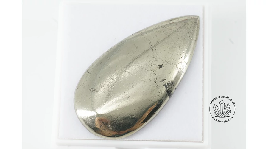 A Pirit egy meglepetés ásvány, mert a színe alapján mind a mai napig úgy hiszik, hogy magas arany tartalmú. Emiatt bolondok aranyának is nevezik. A színét még sem emiatt kapta, hanem a fémes szerkezetben lévő magas vas és kén tartalom miatt. A kén tartalmát kénsav gyártásra használták, a vas tartalmából vas fémet kohósítottak és a nagyon nagy tömegű maradékból maximum 1 % aranyat tudtak kinyerni tonnánként. Mindezek az ipari folyamatok nagyon nagy környezetszennyező technológiával történtek, ezért leálltak a kinyeréssel. Más dolog, hogy a közép és dél amerikai ősi indián kultúrákban a fényes vagy fényezett Pirit ásványt tükörnek használták. Viszonylag könnyen csiszolható, szinte lemoshatatlan fekete bevonatot képez a csiszolók bőrén, de ragyogó felületre lehet csiszolni. Ezeket a darabokat egy indiai csiszoló üzemben készítették, a kabosonok alja csak simára csiszolt, nem fényezett! A darabokban látható fekete zárványok idegen ásványok nyomai. A képen bemutatott hosszú csepp kaboson mérete: kb. 50,5 x 26 mm, vastagsága kb. 4 mm. A darabot 5 x 5 cm-es ékszerdobozban küldjük.
