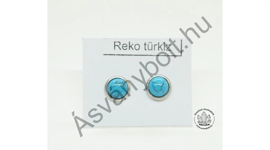 A Rekonstruált türkiz fényes fekete erezetes 6 mm-es, alul lapos, felül domború köveit ragasztottuk a nemesacél foglalat szerű tüskéhez, amihez gumibetétes fémharangot adunk a rögzítéshez. A rendelt termék hasonló mintázatú lesz a képen bemutatott fülbevalóhoz képest.