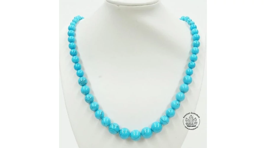 A Rekonstruált türkiz csiszolt golyóiból fűztünk középre növekvő szemű láncot. Az anyaga a fekete sávozottság miatt látványos. A lánc végein 6 mm-es, a lánc közepén 12 mm-es a golyók mérete, a lánc végeit nemesacél alkatrészek zárják le. A lánc hossza kb 52 cm.