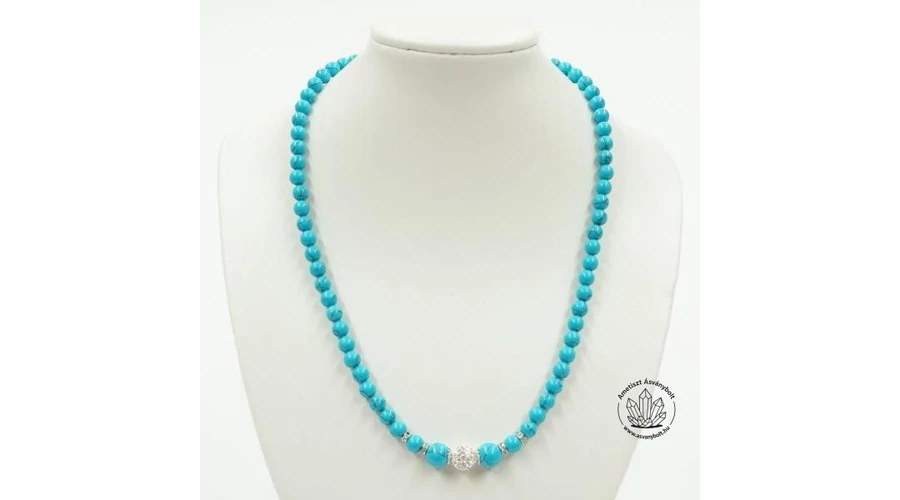 A Rekonstruált türkiz féldrágakő egyszerű 6 mm-es és 8 mm-es golyóiból is lehet néhány strasszos kellék felhasználásával szép ékszert készíteni. A lánc hossza kb 45 cm, az anyag sodronyra van fűzve és erős mágneskapocs fogja össze a láncot. Ára : 3900 Ft. Készlet : 5 db.