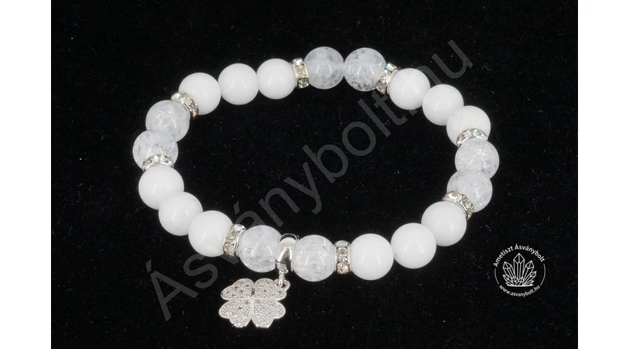 A Repesztett hegyikristály csillogó és a Tejkvarc hófehér 8 mm-es válogatott golyóiból alkottunk karkötőt, amit fehér strassz gyűrűkkel és lóhere függővel díszítettünk. Egyedi színek, egyedi ragyogás, elegáns ékszer! A karkötő anyagait duplasoros gumira fűztük, a karkötő csukló mérete kb. 16,5 cm.