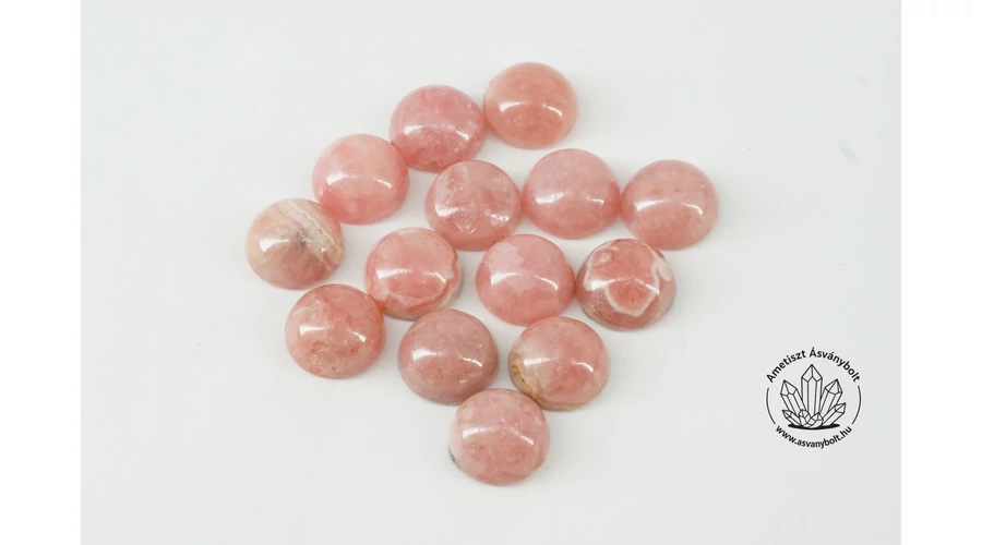 A Rodokrozit extra minőségű anyaga Argentinából származik, nagyon népszerű drágakő. Az extra minőségű Rodokrozit változó málna piros színű, fehér erezettel, felhős rajzolattal, a belőle csiszolt kövek félautomata gépeken készültek, tehát szinte tökéletesek. A csiszolatok mérete kb. 8 – 8,2 mm, magassága kb. 3 – 3,5 mm.