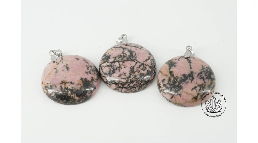 A Rodonit málnapiros és fekete erezetű változatából csiszolt kabosonok mérete kb. 30 mm, az alapján lapos, felülről enyhén domború, mindkét felületén fényes. A képen látható darabokból küldjük a medált a megrendelőnek. Kínában készült extra minőségű csiszolatokból dolgozunk, a fúrást és nemesacél alkatrészeket saját műhelyünkben készítettük. A medál alkatrésszel együtt kb. 41 mm magas.