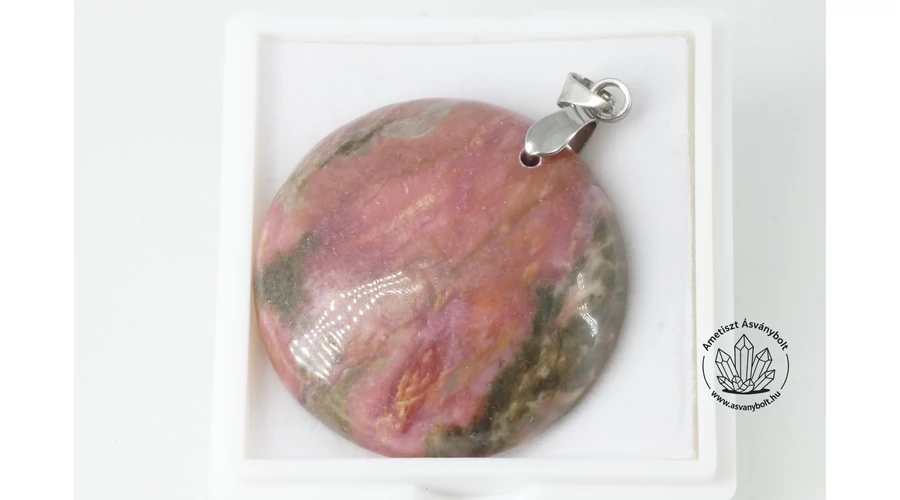 A Rodonit málnapiros és fekete erezetű változatából csiszolt kaboson mérete kb. 30 mm, az alapján lapos, felülről enyhén domború, mindkét felületén fényes. Egy különleges rajzolatú és színű darabból készítettem fúrt medált, a képen látható darabot küldjük a megrendelőnek. Kínában készült extra minőségű csiszolatokból dolgozunk, a fúrást és nemesacél alkatrészeket saját műhelyünkben készítettük. A medál alkatrésszel együtt kb. 41 mm magas.