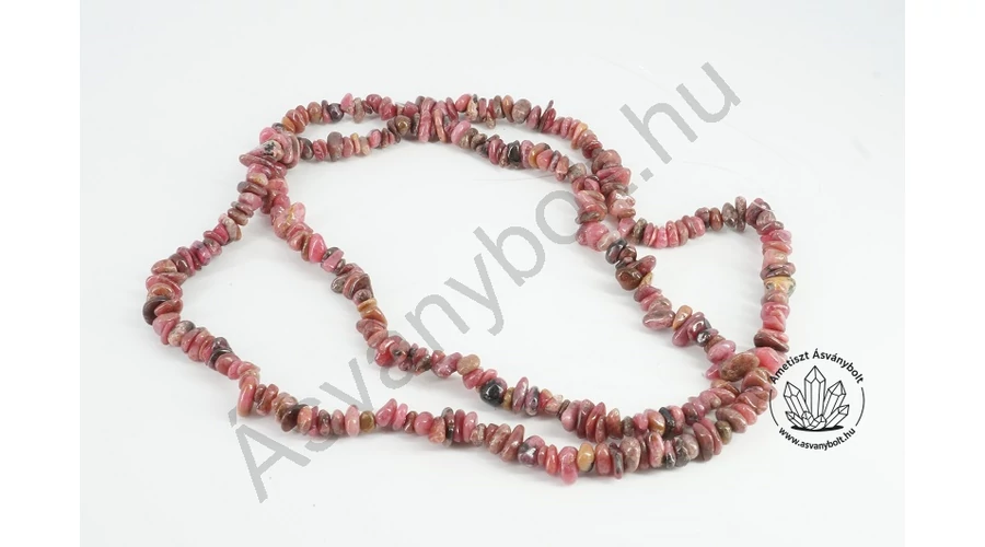 A Rodonit extra sötét rózsaszínű, Brazíliából származó anyagából csiszolták a 80 cm-es szál anyagát. A legkisebb törmelékeket is feldolgozzák, a kb. 5 – 10 mm-es gömbölyített szemeket damilra fűzik kb. 80 cm hosszban, így damilon fűzve lehet megvásárolni. A damil végein csomók vannak.