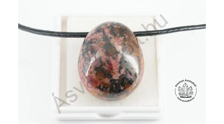 A különleges szépségű brazil rodonit drága nyersanyag. Az élénk málnapiros és fekete- barna foltok mutatós mintát adnak az anyagnak. Az ebből készült medál saját csiszolás és fúrás, műhelyünkben készült, fekete 50 cm-es hengerbőr láncra rögzítettük medálnak. A medál méretei kb. 29 x 24 mm, vastagsága kb. 14 mm.