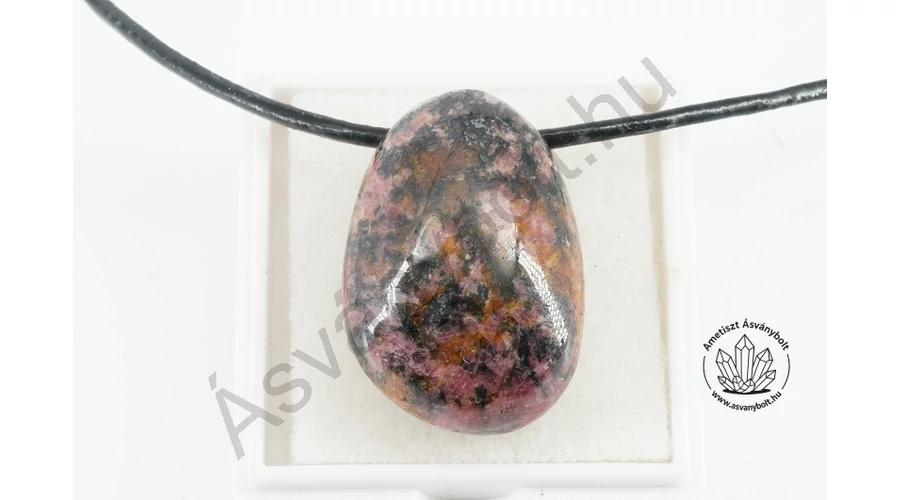 A különleges szépségű brazil rodonit drága nyersanyag. Az élénk málnapiros és fekete- barna foltok mutatós mintát adnak az anyagnak. Az ebből készült szabálytalan formájú, úgynevezett kavics medál saját fúrású, fekete 50 cm-es hengerbőr láncra rögzítettük medálnak. A medál méretei kb. 30,5 x 21 mm, vastagsága kb. 14 mm.