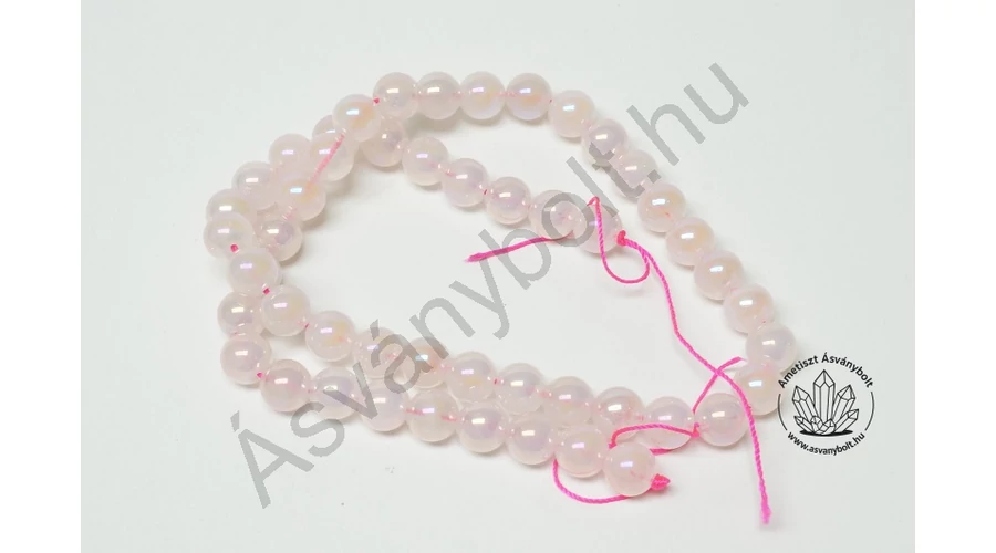 A rózsaszínű szivárványszínű Rózsakvarc aura a szív csakra központot erősíti. A 8 mm-es golyókra csiszolt Rózsakvarcra rögzített fémbevonat felülete tükröződő és áttetsző. A zsinórra fűzött anyag hossza kb. 39 cm, a zsinór végeit csomók zárják le.