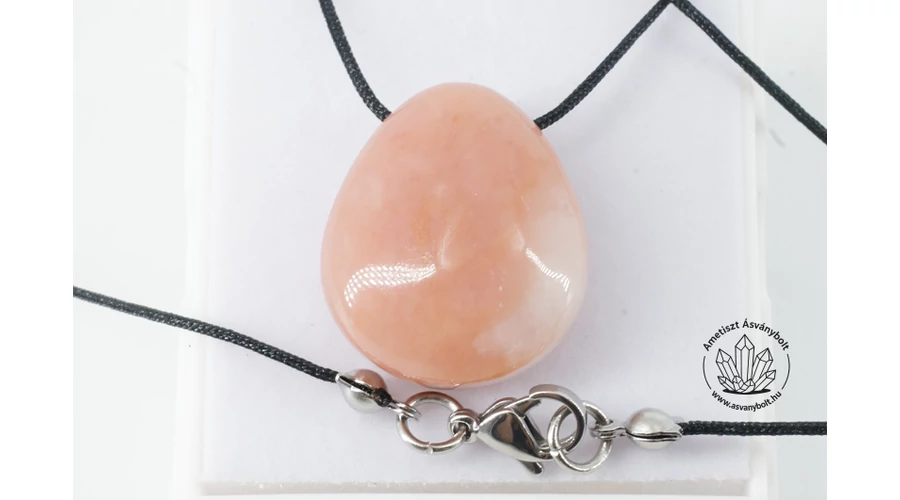A Rózsaopál szép minőségben drágakő, a telt színű vagy érdekes mintájú darabokat ékszerköveknek csiszolják. Lelőhelye Peru magas hegyeiben található. Leginkább halvány rózsaszín – rózsaszín darabjai átlátszatlanok, sok-sok repedéssel és esetleg réteges szerkezettel. Az opálok sokszor rétegesen képződnek, bizonyos részei keményebb kalcedonos szerkezetűek, bizonyos részeiben a fekete foltokat, rajzolatok mangán zárványok okozzák. A medálban a hullámzó opál és kalcedon lerakódásokat látjuk. Ha ezek mutatós minták, akkor érdemes egyedi ékszerkövet készíteni belőlük. A medál különlegessége a “szendvics” vagy “ hamburger” szerkezet, amit oldalról látunk kitűnő minőségben. A domború csepp medál saját csiszolással és fúrással készült a saját műhelyünkben zsinór lánccal és nemesacél alkatrésszel. A medál mérete kb. 25 x 22 mm, vastagsága kb. 11 mm. A medált az 5 x 5 cm-es ékszerdobozkában küldjük.