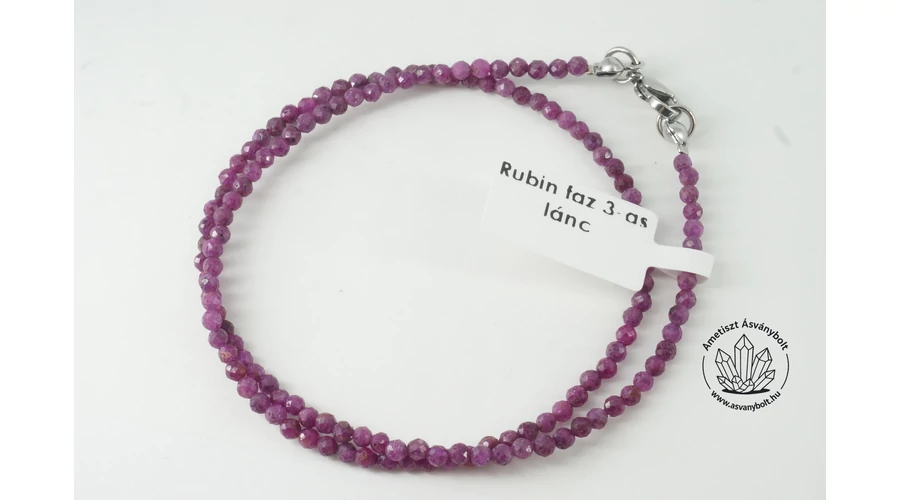 A tanzániai zoizit rubinos anyagból csiszolták a sötét színű, de nem átlátszó fazettált kb. 3 – 3,5 mm-es golyókat. A sodronyra kb. 39 cm anyagot fűztünk, a lánc végeit nemesacél alkatrészekkel zártuk le, így a teljes hossza kb. 43 cm.