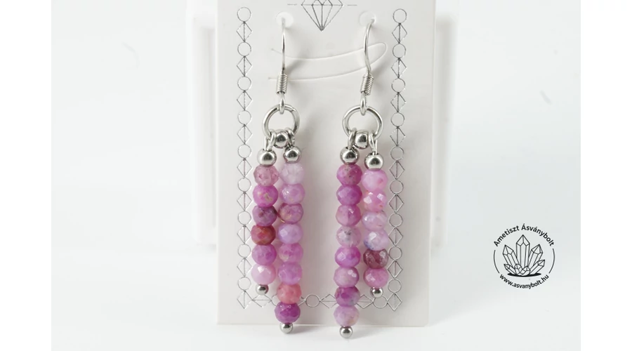 A Rubin extra minőségű, változatos rózsaszínű – vörös valódi színű és átlátszó-áttetsző változatából csiszolt és fazettázott 3 x 4 mm-es golyóiból készítettünk csillogó akasztós fülit néhány nemesacél szerelékkel. A füli akasztható és a végére gumi harangot rögzítettünk. A füli teljes magassága kb. 45 mm. A hordozó kártya változhat a készítés során.