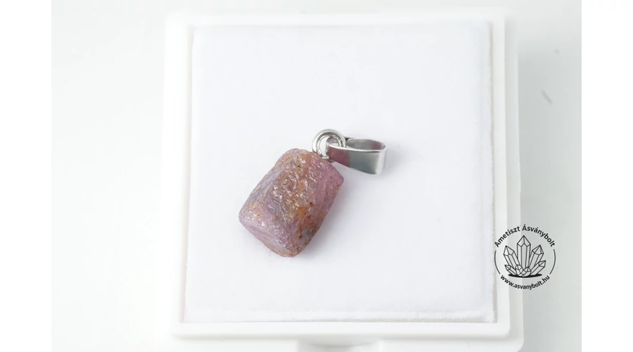 A Rubin természetes formájú, nem csiszolt kristályai sokszor rücskös felületűek a medál készítés céljából, a legjobb minőségben átlátszó és valódi vörös változatban drágák. A Rubin kristály hordó formájú és a végei felé elvékonyodó, keresztmetszeti képe hatszög formájú. A természetes kristályokat alaposan válogatva saját műhelyünkben fúrtuk és nemesacél menetes csappal ragasztottuk medálnak. A ragasztó két komponensből kevert műgyanta alapú ragasztó. A kristály magassága kb. 11 mm, a medál teljes magassága kb. 20,5 mm. A képen látható medált 4 cm x 4 cm-es ékszer dobozkában küldjük.