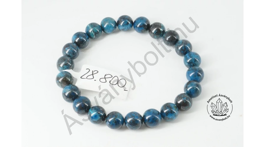 A Krizokolla-Shattuckit ritka ásványékszer anyag, emiatt nagyon drága. Az általam forgalmazott Krizokolla-Shattuckit valódiságát garantálom ! A legjobb minőségű, tömör, válogatott szemekből álló karkötőt mutatok be, amiben kevés Krizokolla, Malachit, Kuprit ( vörös-fekete ) és Limonit ( barna )van, egy kevés fehér Kalcit és Kvarc, az anyag sötétkék színét a Shattuckit adja. Származási helye : Kongó, Namíbia. Az anyag felülete jól csiszolt és fényezett, szép színárnyalatú, a felületén nagyon kevés apró anyaghiba előfordulhat. A golyókat dupla soros gumira fűztük, 17 cm-es csuklóra ajánljuk. A felfűzött anyag golyóinak mérete 8,5 – 9 mm nagyságú.