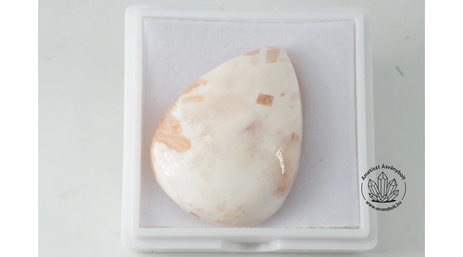 A zeolit ásványok csoportja kevésbé ismert és nagyon híres ásványokból áll. Jelentős alkotói bizonyos kőzeteknek, de önállóan is megjelennek kőzetek üregeiben. A Zempléni-hegyégben Mád környéki riolittufa kőzetekben megtalálható zeolitok nem látványos alkotó részek, megőrölve folyadékok tisztítására, szag elvonásra is használják. Látványos zeolitok a dunabogdányi bányából gyűjtött Kabazit, Sztilbit, Analcim kristályok andezit üregeiben, ugyanezek az indiai bazalt üregekben több cm méretben gyűjtött és forgalmazott ásványok. De a leghíresebb zeolit a kék színű pektolit vagy kereskedelmi néven Larimár. Ez tömött szerkezetű gumókban képződött drágakő, a fehér változatát nem csiszolják. És vannak még tűs, szálas szerkezetű zeolitok a csiszoltak között, mint Tomsonit vagy a Skolecit. A skolecit általában fehér színű, mint Izlandon, de Indiában, a Dekkán fennsík bazaltjában rózsaszínű anyagok is bányászhatók. A jó irányból csiszolt kövek felületén fehér vagy narancs színű szálakat, hasábokat látunk, mindezek metszésében négyzet szerű és áttetsző-átlátszó ablakocskák látszanak. Ezt a látványos szerkezetet mutatják be a kaboson csiszolók az extra minőségű, alul és felül jól csiszolt darabokon, de néhol a szálas szerkezet pici üregeket képez. A kő mérete kb. 32 x 24 mm, 4 x 4 cm-es ékszer dobozban postázzuk.
