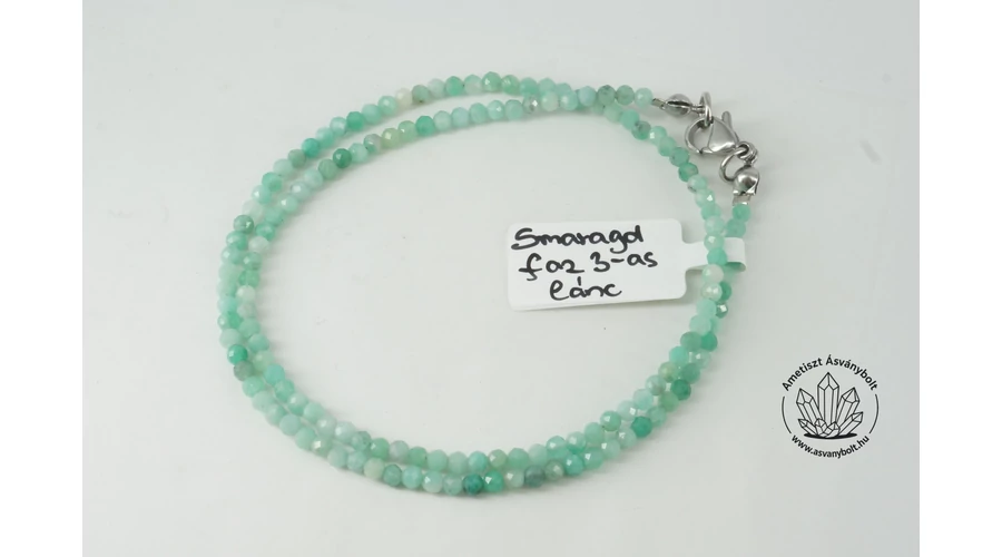 A drágakő Smaragd közepes minőségű, átlátszatlan vagy áttetsző világos zöld színű anyag nagyon kevés kőzetmaradványokkal. Ezt az anyagot már viszonylag olcsón be lehet szerezni és elfogadható minőségű áru lesz belőle. A rendelhető láncok színárnyalata megegyezik a képen bemutatottal. A Brazíliából származó nyersanyagból csiszolt fazettált golyókat acél sodronyra fűztük, a golyók mérete kb. 3 mm, a sodronyra fűzött anyag hossza kb. 39 cm. A sodronyt nemesacél alkatrészekkel zártuk, így a teljes hossza kb. 43 cm.