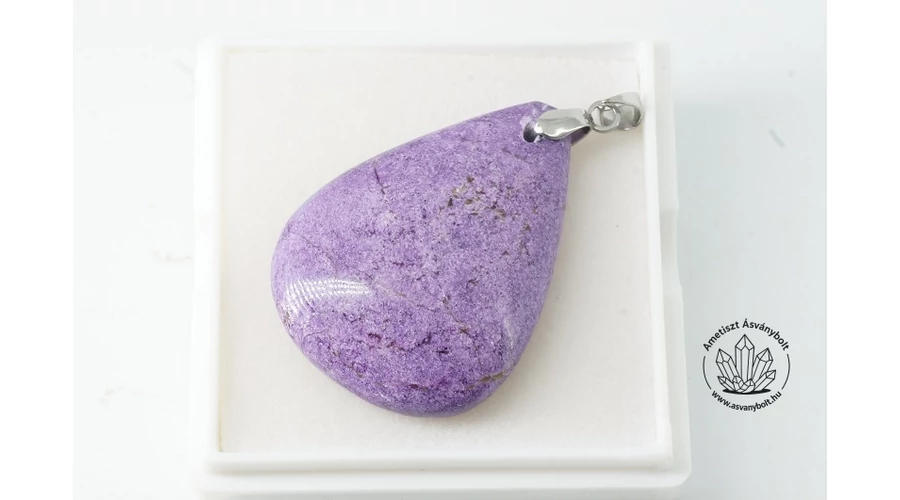 A Stichtit önálló ásvány, leginkább az Atlantiszit – szerpentin ásvány együttes lila színű alkotójaként ismerjük. A mélységi króm tartalmú átalakult kőzetek ásványaiból jött létre a szerpentinnel együtt, ugyanazokon a bányahelyeken találják, Tasmánia, Nyugat-Ausztrália, Dél-Afrika, Altáj terület és még sok helyen. Különleges lila, bordó vagy rózsaszínű megjelenése miatt dolgozzák fel dísztárgyaknak, ékszereknek. Fontos tudni, hogy puha ásvány, keménysége megegyezik a nagyon híres zöld Szerafinit-Klinoklór ásvány keménységével, tehát tároláskor óvatosan bánjunk vele. Szerkezete nem egységes, halványlila szemcsék, erezetek, foltok tömörülése a zöld vagy zöldes barna szerpentinben. De önállóan is látványos csillogású a szerkezete - felülete. Színe természetes, rajzolata megismételhetetlen. Saját kézi csiszolású és fúrású darab. A csepp medál magassága alkatrésszel együtt  kb. 47 mm magas, felül domború felületű, alulról lapos. Az alkatrész nemesacélból van. A medált 50 x 50 mm-es dobozkában küldjük.
