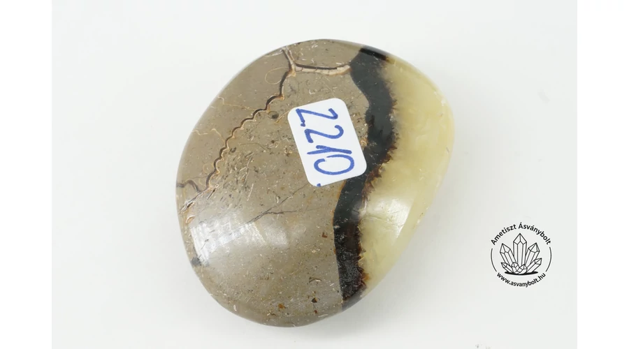 A Szeptária egy különleges ásvány képződés üledékes kőzetekben. A vas, mangán esetleg mész tartalmú iszap tömörödik, kiszárad, az évmilliók alatt kőzetté válik. Az iszapban található karbonát ásványok mint kalcit, sziderit esetleg dolomit a kiszáradt kőzetiszap repedéseit teljesen vagy részben kitölti és látványos szerkezetet hozhat létre. A Szeptária általában gumók formájában preparálódik ki a lazább üledékes kőzetekből, iszap kövekből majd széttörve vagy csiszolva látszik a szerkezete. Ha üreges, akkor a belsejét fogakhoz hasonló sárga Kalcit kristályok is boríthatják, mint a madagaszkári szeptáriákban vagy fekete Sziderit kristályok bársonyos felületet alkotva szintén onnan. A magyarországi üledékes kőzetekben szintén van szeptária pl, a Gánt környéki bauxit kőzetekben vagy az alsótelekesi mészköves és agyagos kőzetekben. A képen bemutatott szappankő kalcitos szeptária, ezért sárgás-barnás az iszapkő, ami nem fényezhető. Lelőhelye Madagaszkár. Mérete kb. 43 x 33 mm.