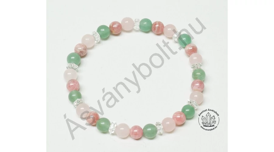 A csakra központok a test energetikai központjai, amelyek a szervek és ezáltal az egész szervezet működéséért felelősek. Elhelyezkedésük szerint a testünk hossztengelyében a fejtetőtől a gerinc mentén a farok csigolyáig találhatók. Általában jellemző színekkel ábrázolják a helyüket a testen, ahol fontos szervek helyezkednek el a testünkben. Mindig alulról a fejtetőig soroljuk őket és jellemző színeik miatt jellemző színű köveket társítunk hozzájuk. A szív csakra: aventurin, malachit, smaragd, krizopráz, jade, krizokolla, krizolit, rózsakvarc, kunzit, rodonit, rodokrozit. A szív csakra karkötő 6 mm-es Rózsakvarc, Rodokrozit és Aventurinkvarc golyókból van összefűzve duplasoros gumira, díszítő elemként – erősítőként Hegyikristály fazettált tárcsákat fűztünk bele. A karkötő mérete 17 cm körüli.