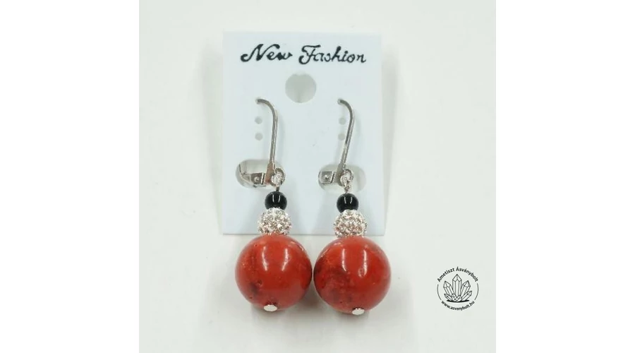 A Szivacskorall népszerű színe miatt kedvelt ékszerkő. Az anyagból csiszolt 14 mm-es golyókat csillogó 6 mm-es strasszgolyókkal és az Ónix 4 mm-es golyóival kombinálva készítettünk belőlük akasztós fülbevalót. A fémalkatrészek antiallergén fémek, a fülbevalót becsomagolva a fülikártyán küldjük. A füli magassága kb 4,5 cm .