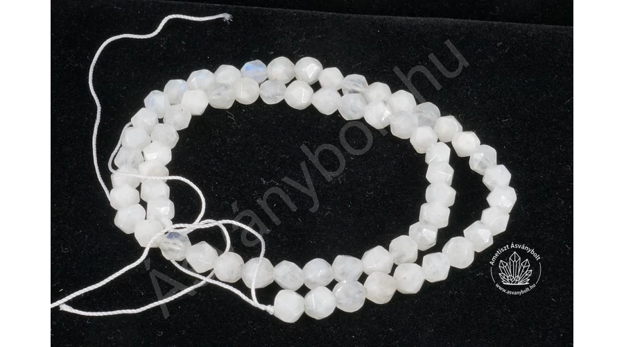 A Holdkő a legnépszerűbb ásványékszer, a belőle csiszolt termékek nagy választékban kaphatók. A különleges csiszolású kb. 6 mm-es golyók egységes fehér színűek kevés fényjátékkal, ezért látványos ékszerek anyagai lehetnek. A háromszög és trapéz lapokkal fazettált golyókat zsinórra fűzték, a zsinór végeit csomók zárják le, az anyag hossza kb. 38,5 cm.