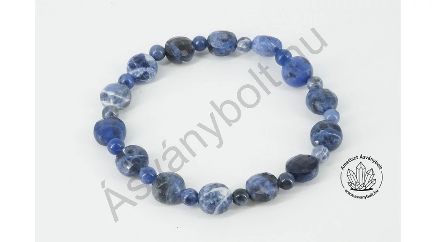 A Szodalit különleges formájú, mindkét oldalán domború és fazettált 8 mm-es korong formáit fűztük össze 4 mm-es Szodalit golyókkal. A korongokat élből fúrták és váltakozó sorrendben fűztük meg egy kb. 17,5 cm-es karkötőnek. Az anyagokat gumi damilra fűztük.