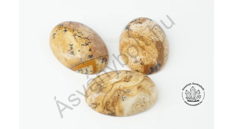 A Tájképjáspis sárgásbarna alapon sötétbarna vagy szürke erezetes anyag mintája változatos. A belőle csiszolt kaboson mérete 18 x 25 mm, az alapján lapos, felülről enyhén domború, mindkét felületén fényes. Alkalmas foglalható, ragasztható és körbefonható ékszerek készítéséhez. Színe természetes, a képen látott darabokhoz hasonlóakat tudunk küldeni. Ára : 800 Ft.