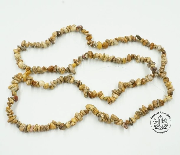 A Tájképjáspis anyagát gömbölyítve csiszolták kb 1 – 1,5 cm méretűre, ebből fűztek szállító damilra kb. 85 cm-t. A végeket csomók zárják le, a szálat így alkatrészek nélkül lehet vásárolni, a terméket saját munkával lehet bármilyen ékszernek elkészíteni. Hozzávaló kellékek az alkatrészek menüben választhatók.