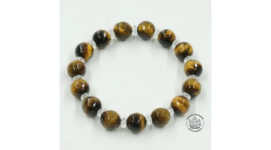 A Tigrisszem fazettált 10 mm-es golyóit és a Hegyikristály fazettált 5 x 2 mm-es tárcsáit váltakozva fűztük össze duplasoros gumira egy kb 20 cm-es karkötőnek. Készlet : 3 db. Ára : 3600 Ft