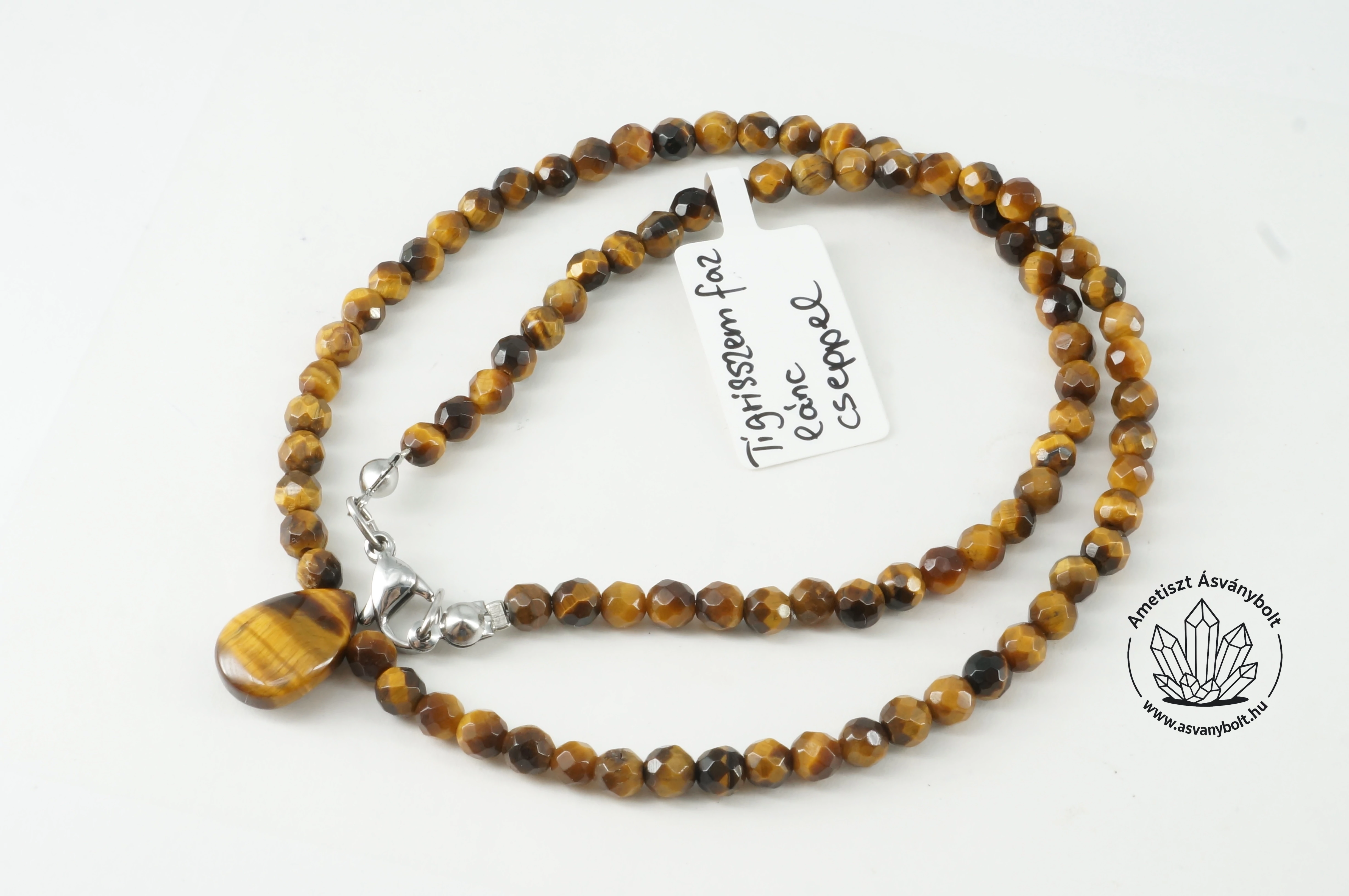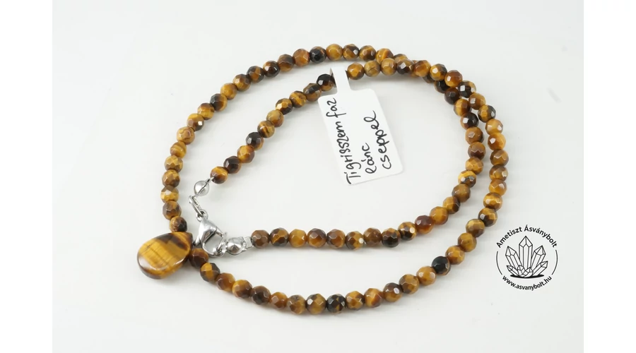 A valódi Tigrisszem sárgásbarna – barna színű, nem festett anyagú, a különleges fényjátéka miatt nagyon népszerű ásvány, a fazettált golyók mérete 4 – 4,5 mm. Az acélsodronyra fűzött anyagot nemesacél alkatrészekkel végezzük, így a lánc teljes hossza kb. 43 cm. A lánc közepére egy 14 x 10 mm-es fazettált csepp formát fűztünk.