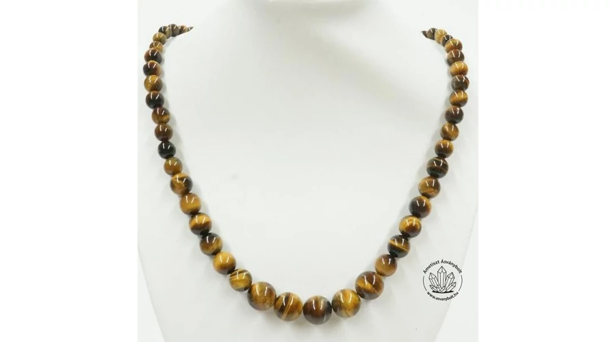 A Tigrisszem népszerű ásványékszer anyag csiszolt golyóiból fűztünk középre növekvő szemű láncot. A lánc végein 6 mm-es, a lánc közepén 12 mm-es a golyók mérete, a lánc végeit nemesacél alkatrészek zárják le. A lánc hossza kb 51 cm.