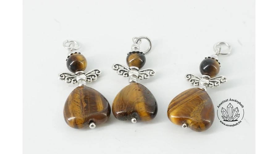 A különleges barnássárga fényjátékkal rendelkező Tigrisszem 14 mm-es szív csiszolatot és 6 mm-es golyót szerkesztettük össze tündér medálnak. A fém szerelékek réz-ródium bevonatos és cink öntvény alkatrészek. A medál teljes magassága kb. 37 mm.