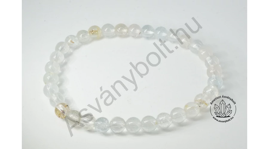 A Topáz a természetben ritkán fordul elő jó minőségben, ezért a drágakövek közé sorolják. Legkedveltebb természetes színe a kék, kevésbé ismerik a zöld, fehér sárga és pirosas színeit. A kevésbé átlátszó és fehér, zárványos anyagból olcsóbb csiszolatokat készítettek. A kb. 6 mm-es golyókat fehér dupla soros gumikra fűztük, így fehér esetleg sárgás, ritkán kékes az anyag. Ezért nevezem ezt az anyagot AB minőségnek. A kb. 17 cm-es csukló méretre van fűzve dupla soros fűzőgumira.