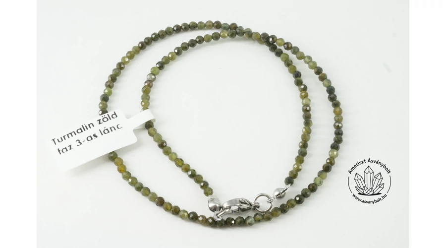 A Turmalin zöld anyagát Verdelitnek is nevezik. A világos és sötétzöld átlátszatlan és átlátszó anyagából csiszolt és fazettált 3 mm-es golyókat acél sodronyra fűztük. A lánc végeit nemesacél alkatrészek zárják le, így a lánc teljes hossza kb. 43 cm.