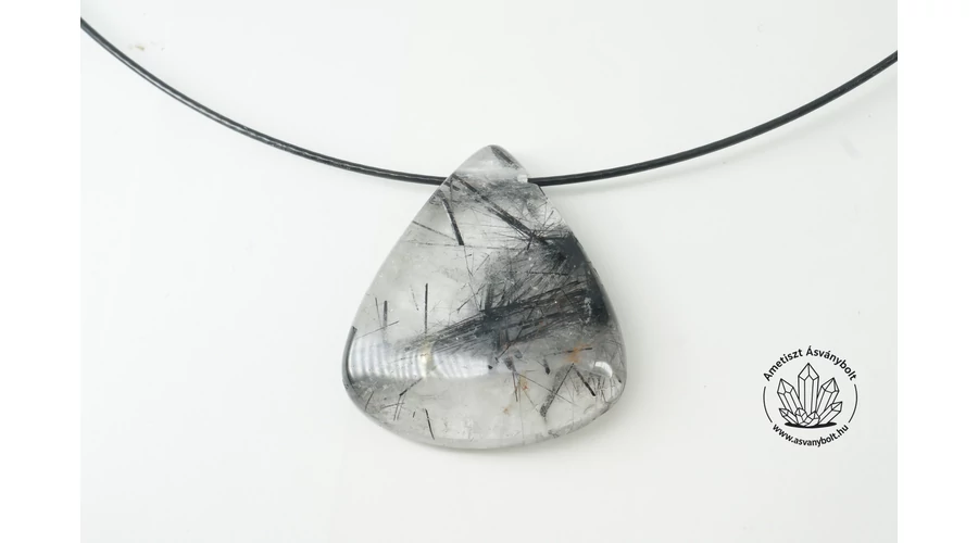 Különleges és emiatt értékes a fekete Turmalin kristályokkal átszőtt Turmalinkvarc, ami ha átlátszó hegyikristályba vagy füstkvarcba nőtt bele, akkor drágakő minőség. Ebből az anyagból alul lapos, felül domború kaboson formákat csiszoltak, így is kedvelt ékszer. Minősége ekkor fekete Turmalin és átlátszó hegyikristály vagy füstkvarc, jellemző benne a nagy kövek esetén a turmalin tűk kusza hálózata. A követ indiai csiszoló üzemekben csiszolták extra minőségben, egy kevés zárványt láthatunk bennük. A medál fúrását és fekete sodrony láncra szerelését saját műhelyünkben végeztük. A sodrony lánc hossza kb. 45 cm. A kő mérete kb. 34 x 30 mm, a láncot bársony ékszer tasakban postázzuk.
