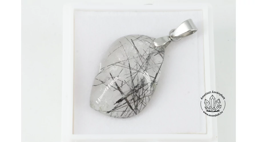 Különleges és emiatt értékes a fekete Turmalin kristályokkal átszőtt Turmalinkvarc, ami ha átlátszó hegyikristályba vagy füstkvarcba nőtt bele, akkor drágakő minőség. Ebből az anyagból alul lapos, felül domború kaboson formákat csiszoltak, így is kedvelt ékszer. Minősége ekkor fekete Turmalin és átlátszó hegyikristály, jellemző benne a nagy kövek esetén a turmalin tűk kusza hálózata. A köveket indiai csiszoló üzemekben csiszolták extra minőségben, itthon a kövek fúrását és nemesacél alkatrésszel medállá készítését végeztük. A medál mérete alkatrésszel együtt kb. 38 x 16,5 mm, 4 x 4 cm-es dobozkában postázzuk.