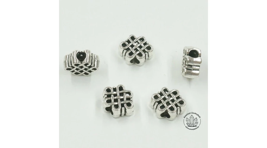 A termék cink öntvényből készült, felülete ródium bevonatos. A mérete 9 x 11 mm, vastagsága 5 mm. A furata a rövidebbik oldalon van, a furat mérete 3 mm. A mintája áttört, tehát a csomóban át lehet látni. Rendelhető legkisebb mennyiség 10 db x 42 Ft, tehát egy csomag 420 Ft.