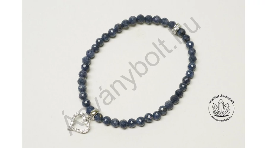 A Zafír sötétkék, átlátszatlan fazettált 3,5 - 4 mm-es golyóiból fűztünk karkötőt gumi damilra. A karkötőbe mikro strassz gyűrűt és lyukas szív függőt építettünk be.